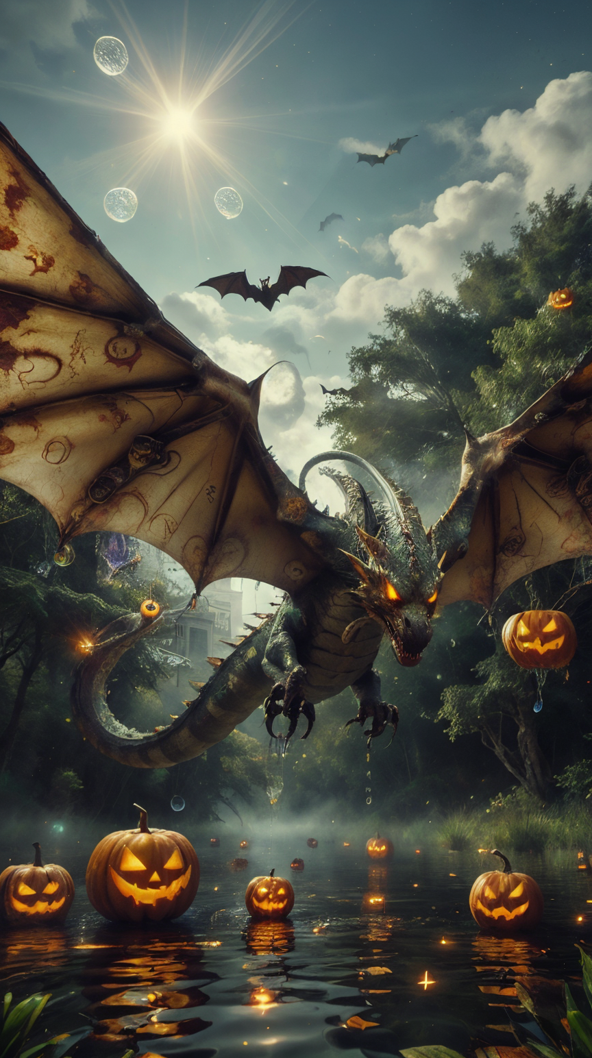 <lora:HalloweenGlowStyle:1>RAW Photo of HalloweenGlowStyle White a dragon taking flight from an enchanted lake, water droplets sparkling in the sun, (Masterpiece:1.3) (best quality:1.2) (high quality:1.1)
