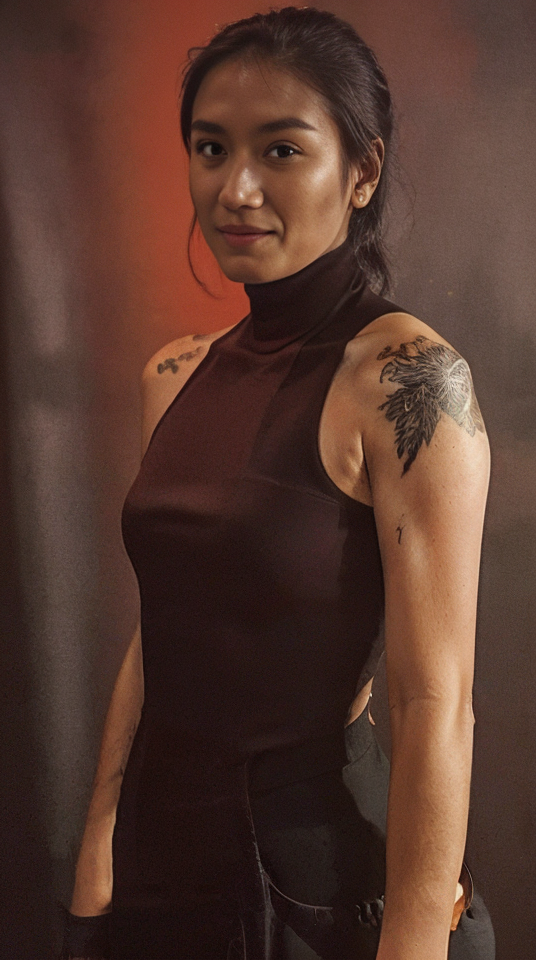 fashion photo of ohwx renatta wearing a red turtleneck, <lora:ohwx_mcren_v2:0.8>, in a dark theme, (pitch black background:1.2), subtle lighting, bare shoulder showing her arm tattoo, <lora:add_detail:0.4> , facing front, grinning at the viewer, bully expression, looking at viewer