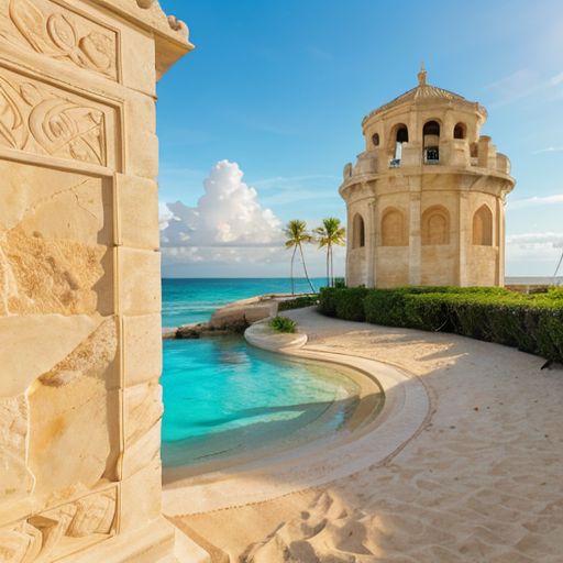 {roman villa with thin tower, roman house, roman mansion, material - marble, symmetric, marble walls, tile roof, tropics, palm trees, light blue ocean, light blue water, evening, dawn}, [ultrahd 4k, 4k resolution, hyper realistic gopro photo, full body view, photorealism, epicRealism, Realism, shadow play, real photo, real life], view of the sea, view of the ocean, beach, white sand, white sand beach