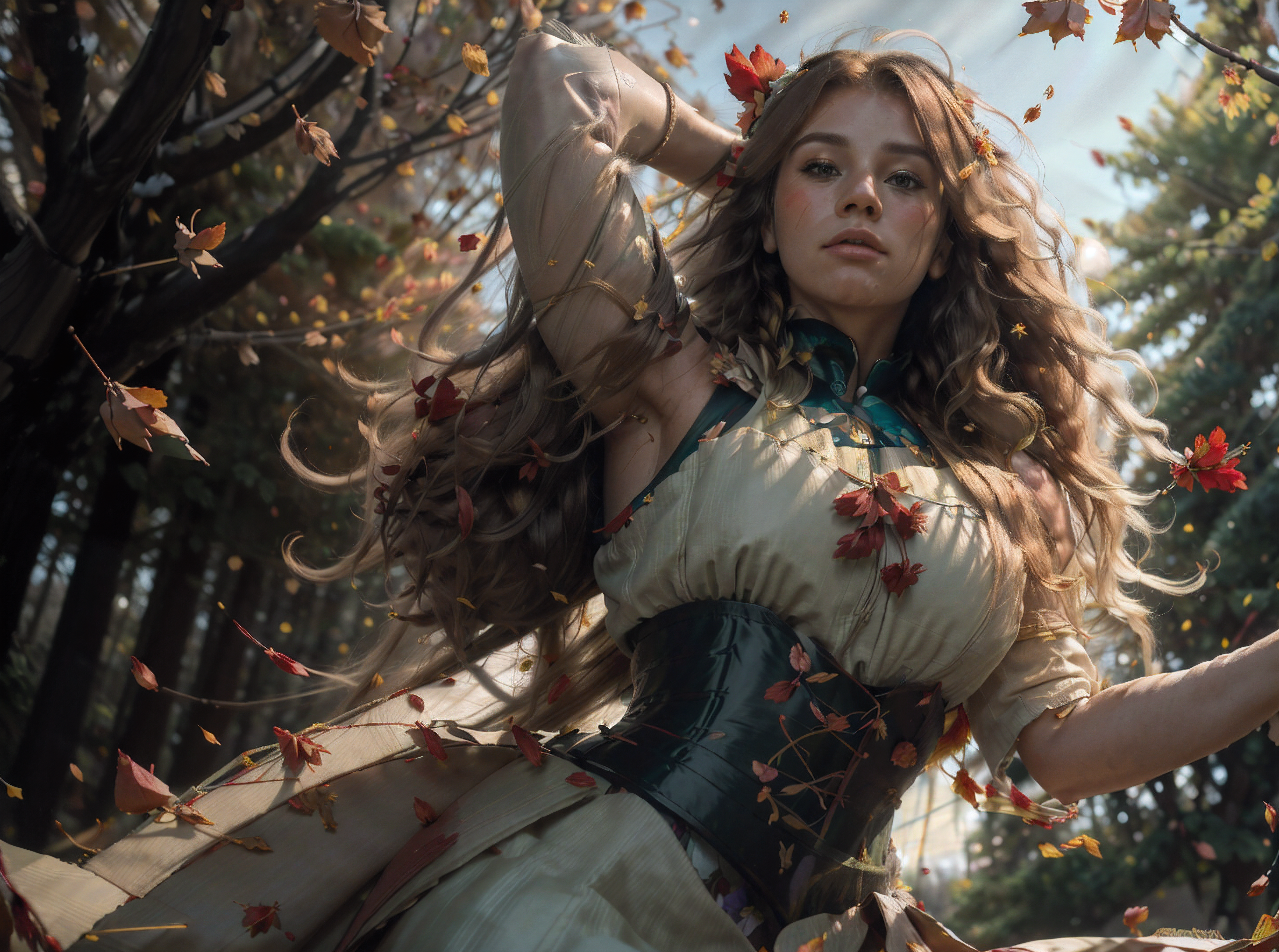 (thick forest:1.6) ,(tree in the background:1.6), RAW photo, beautiful,(F1.2:1.5)(bokeh effect:1.7), perky, slender, slim, woman with flowers,(messy blond hair:1.5),( red flower petals:1.5), (petals falling:1.8), (falling leaves:1.8), sunset light, (high detailed skin:1.2), 8k uhd, dslr, soft lighting, high quality, film grain, Fujifilm XT3,(Alphonse Mucha), (Charlie Bowater), (Daniel Ridgway Knight), (Albert Lynch), (Richard S. Johnson), (from below:1.6), dramatic lighting, (hair blown in the wind:1.7), staring at viewer, autumn colors, messy hair, <lora:wowifierV3:0.7>,<lora:detail_slider_v4:1.0>, fogy , sun glow from behind, sunset, dusk, <lora:ClothingAdjuster3:-0.1> , magical dark,
