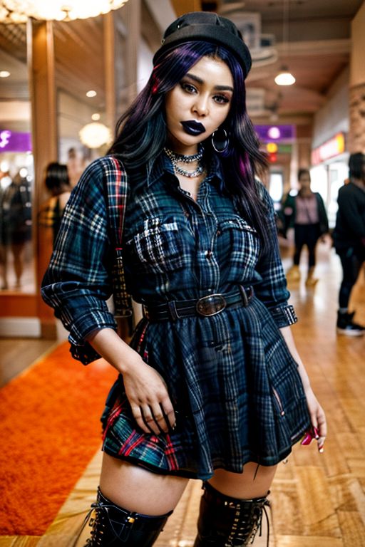 25 year old (Nigerian:1.4) goth girl, cute face, mall goth, oversized (plaid shirt:1.4) worn as a dress cinched with a studded belt, knee-high lace-up boots, mall interior background, chubby gothgirl, muffin top, (pale skin), perfect anatomy, perfect hands, perfect face, perfect makeup