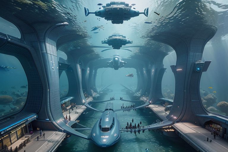 underwater futuristic Cityscape with people, futuristic underwater vehicles .futuristic routes and futuristic train