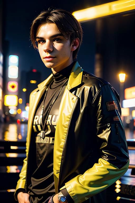 Young man, hypercar, cyberpunk city, hyperdetailed, intricately detailed, deep color, 8k resolution, photorealistic, masterpiece, cinematic lighting, blonde, (hyperdetailed eyes)