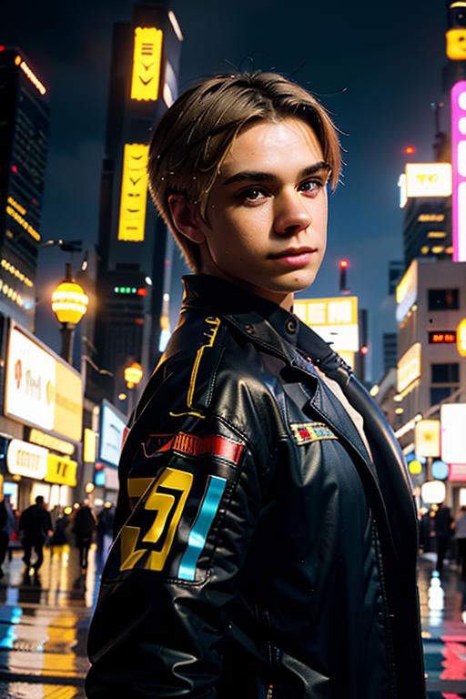 Young man, hypercar, cyberpunk city, hyperdetailed, intricately detailed, deep color, 8k resolution, photorealistic, masterpiece, cinematic lighting, blonde, (hyperdetailed eyes)