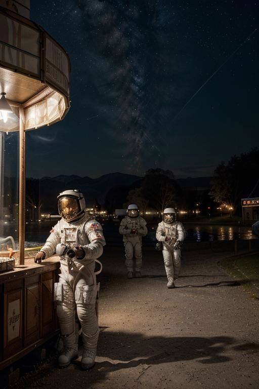 ((astronauts with their helmets on)) at a park small night fair, fair stails, christmas lights, , night, a castle and a lake background, professional photography, dramatic light, RAW quality, uhd,