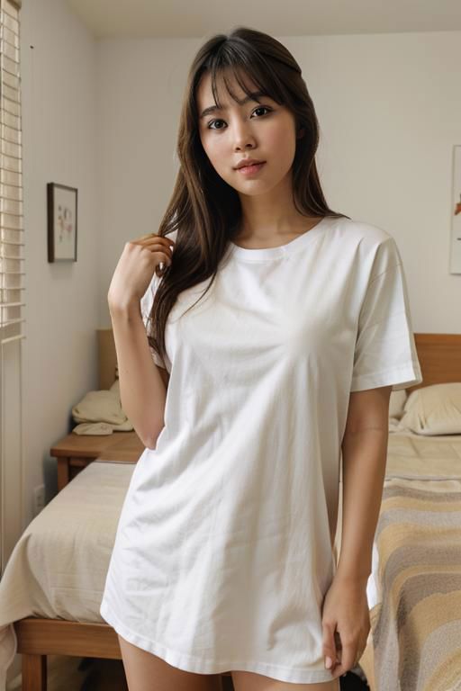 (best quality, masterpiece), hdr, 8k, closeup+ BREAK cute beautiful dreamy yawning young adult girl, standing in bedroom, (hand in hair), white tshirt Japanese girl