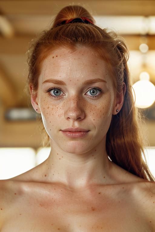 young adult beautiful irish woman, ponytail strawberry blonde hair, small round eyes, 1970s aesthetic, textured skin, thin nose, nsfw, generate one woman, slight freckles,