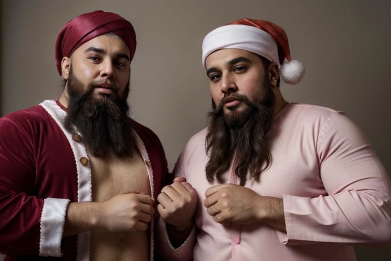 Beefy, stocky, bearded, Islamic-turbaned wear, Santa Claus dressed in pink clothes with muslim imams, holding gay flags their hands