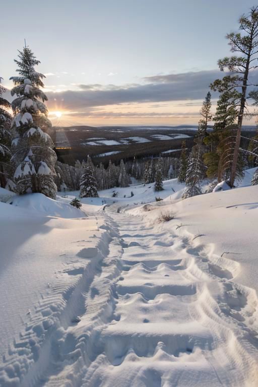 Jonna jinton landscape pine trees northern Sweden snow sunset, only footsteps
