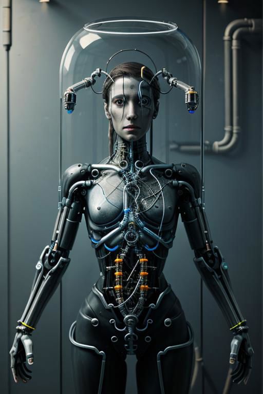 Partially constructed cyborg, glass body, pipes, wires, circuits, mechanical parts, biomecanical