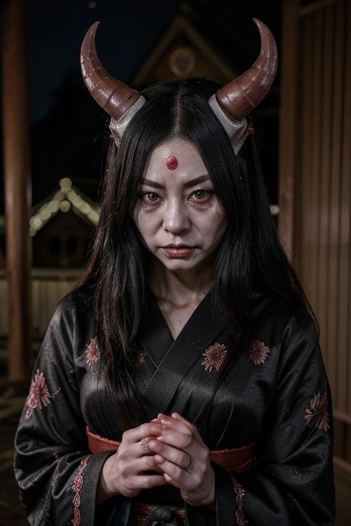 a beautiful Japanese Yokai woman, horns, ((creepy)), ((medium shot)), (((night))), bizarre, old poorly-haunted japanese temple, hyper-realistic, ultra-detailed, insanely detailed, 4k, realistic 8k, shot on portra 400