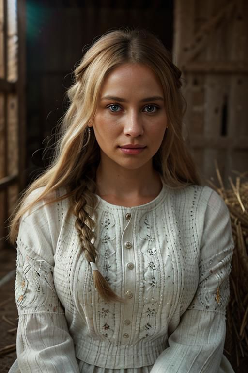 buxom ukrainian woman, (traditionally braided light blonde hair), hiding in large barn, sitting on hay stack cubes, tight traditional white cotton clothes with floral Embroideries ,natural skin texture, sad, steadfast, proud, big breast,warm light falls through window from behind, shadows over her chest, big tits, Award - winning, portrait photograph shot, 8K textures, soft cinematic light, adobe lightroom, photolab, hdr, intricate, elegant, highly detailed, sharp focus, ((((cinematic look)))), soothing tones, insane details, intricate details, hyperdetailed, low contrast, soft cinematic light, dim colors, exposure blend, hdr, faded