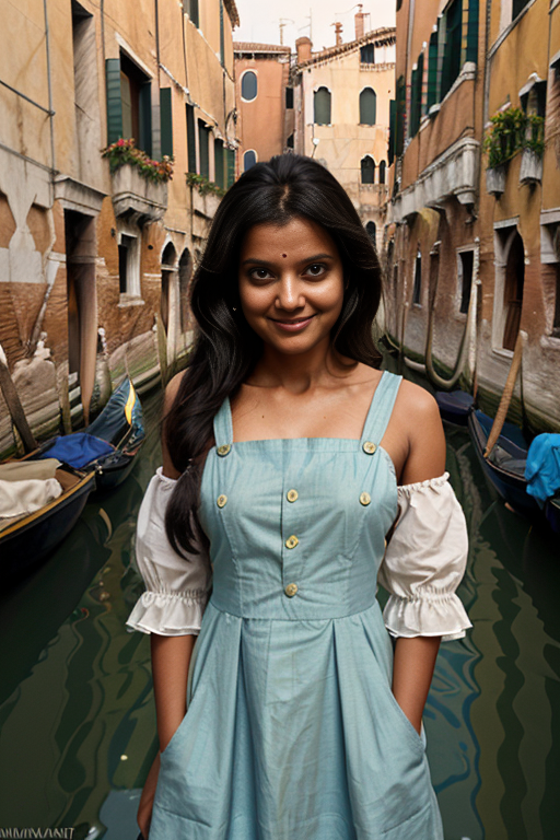 Onoff, Indian woman wearing a pinafore dress with puffy sleeves, Venice canal, smile, looking at viewer, jp-Amanda-400, by Steve McCurry, by Lee Jeffries, by Jeremy Mann