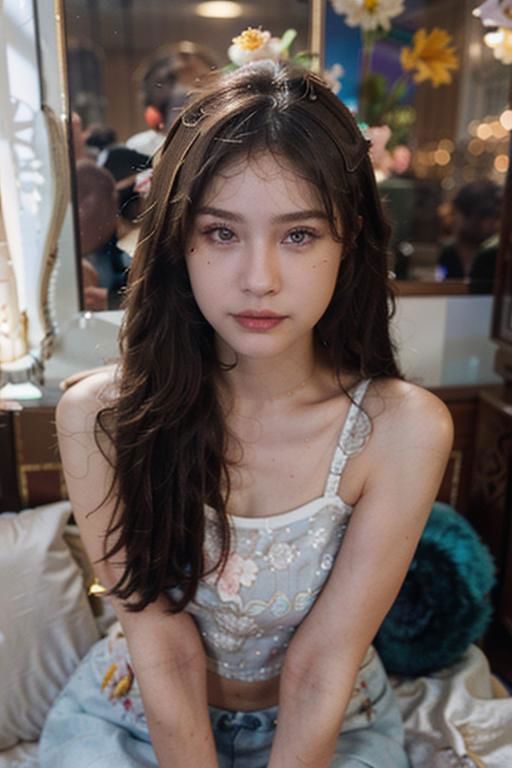 ultra hd, upscale, realism, (realistic), high detail face, young chinese woman, Asian and Russian crossbreed,Half-breed with asia and russian,, full body, thin bristles, small bristles, long eyelashes , cute makeup, painted lips, juicy lips, detail blue eyes, balance eyes, precise position two eyes, The two eyes are the same, miror eye, same size eyes, one mole under right eye, smile, deatail skin in face, detail pores, pores in skin, fitness body, 4 packs, strong body, revealing white armpits, muscle, gymer, smile, Show off her navel, professional model, professional pose, 2 strands of hair in front of the face, pony tail long brown hair, flower in hair, detail hair, better hand, detail lip, asian cute girl, sharp focus, gorgeous, can see the details of the fabric clearly, thread detail sticking out on the fabric, detail background, realistic background, sunshine, dramatic, award winning, cinematic lighting, octane render unreal engine, the most beautiful in the world ,flower tank top, flower detail skirt, flowe garden background, flower armor, blue theme, exposure blend, medium shot, bokeh, show legs, full body, super big boods, (hdr:1.4), high contrast, (cinematic, teal and orange:0.85), (muted colors, dim colors, soothing tones:1.3), low saturation, displacement, bump