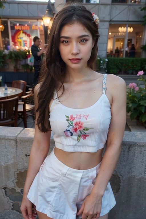 ultra hd, upscale, realism, (realistic), high detail face, young chinese woman, Asian and Russian crossbreed,Half-breed with asia and russian, thin bristles, small bristles, long eyelashes , cute makeup, painted lips, juicy lips, detail blue eyes, balance eyes, precise position two eyes, The two eyes are the same, miror eye, same size eyes, one mole under right eye, smile, deatail skin in face, detail pores, pores in skin, fitness body, 4 packs, strong body, revealing white armpits, muscle, gymer, smile, Show off her navel, professional model, professional pose, 2 strands of hair in front of the face, pony tail long brown hair, flower in hair, better hand, detail lip, asian cute girl, sharp focus, gorgeous, can see the details of the fabric clearly, detail background, realistic background, sunshine, dramatic, award winning, cinematic lighting, octane render unreal engine, the most beautiful in the world ,flower tank top, flower skirt, flowe garden background, flower armor, blue theme, exposure blend, medium shot, bokeh, show legs, full body, super big boods, (hdr:1.4), high contrast, (cinematic, teal and orange:0.85), (muted colors, dim colors, soothing tones:1.3), low saturation, displacement, bump
