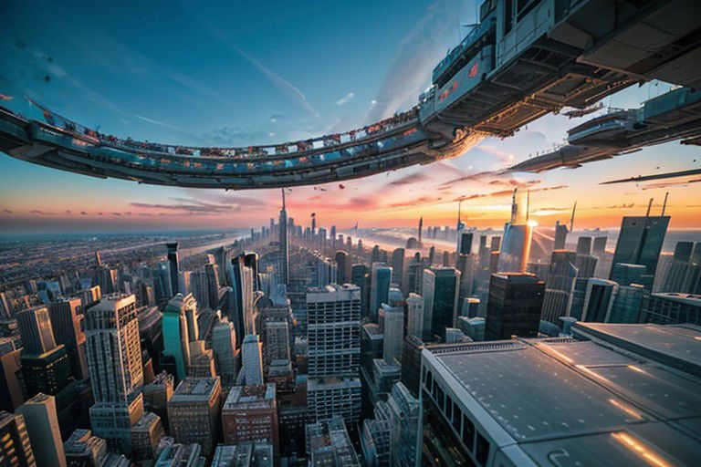 hundreds of weightless humans floating into the sky, High-rise Buildings under a vibrant sunset sky amidst a futuristic cityscape, panoramic cityscape, vibrant and dynamic lighting, flying vehicles weaving through skyscrapers, and intricate alleyways.