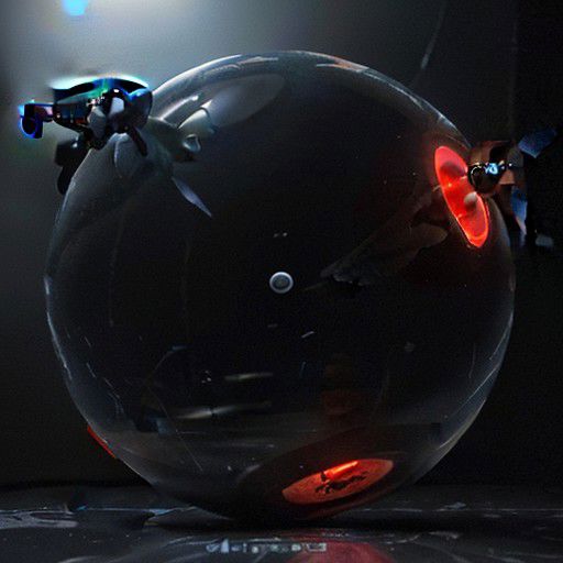 ((Marble)) drone, made with magnet material, sphere, futuristic, flying, ((organically)) Movie screenshot of science fiction, dark, foggy, ultra detailed, hd, 8k, soft A dark, futuristic, ((without propeller)) jellyfish shiny organism that emits red and blue lights, (most realistic) It is illuminated by their complex designs and patterns reflected on the marble surface