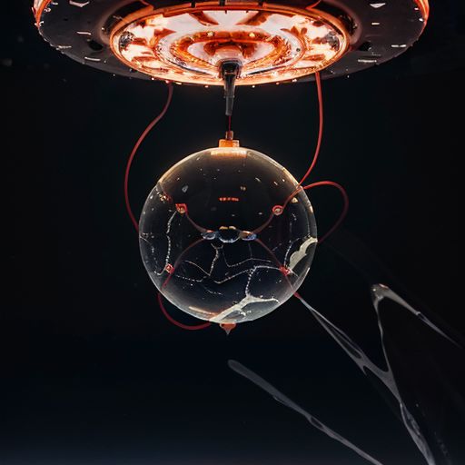 ((Marble)) drone, made with magnet material, sphere, futuristic, flying, ((organically)) Movie screenshot of science fiction, dark, foggy, ultra detailed, hd, 8k, soft A dark, futuristic, ((without propeller)) jellyfish shiny organism that emits red and blue lights, (most realistic) It is illuminated by their complex designs and patterns reflected on the marble surface