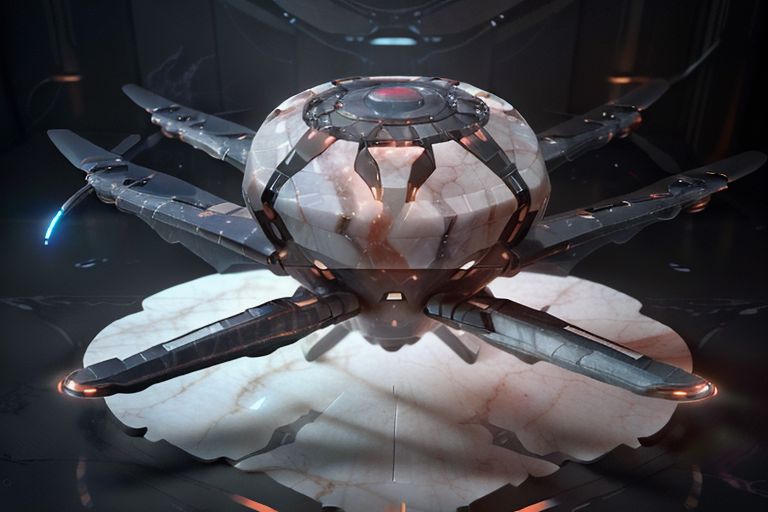 ((Marble)) drone, made with magnet material, sphere, futuristic, flying, ((organically)) Movie screenshot of science fiction, dark, foggy, ultra detailed, hd, 8k, soft A dark, futuristic, ((without propeller)) jellyfish shiny organism that emits red and blue lights, (most realistic) It is illuminated by their complex designs and patterns reflected on the marble surface
