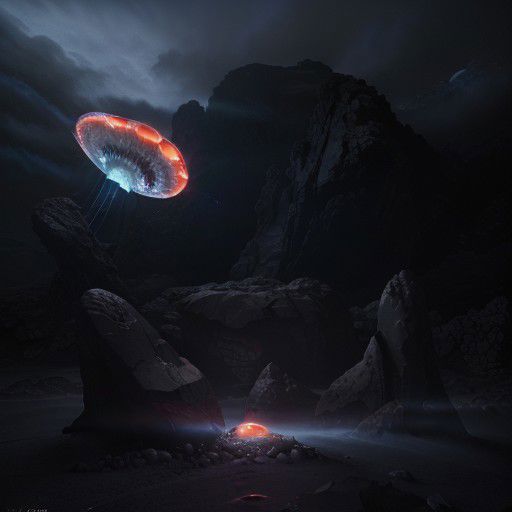 (rock material), made with magnet material, (disk shape), futuristic, flying, ((organically)) Movie screenshot of science fiction, dark, foggy, ultra detailed, hd, 8k, soft, ((among the clouds)) A dark, futuristic, ((without propeller)) jellyfish design, shiny organism that emits off-peak red and blue lights, (most realistic) (stone surface)