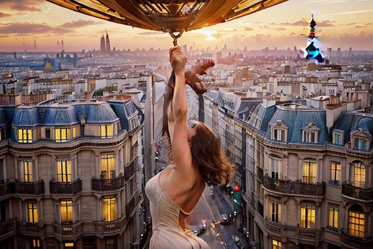 Capture a gripping moment atop the Eiffel Tower: a woman hanging off the edge of the Eiffel tower, with the sprawling city below. Convey the intensity of the scene against the iconic cityscape, emphasizing the emotional narrative in a powerful yet concise composition. The Seine River weaves through the city, reflecting the warm hues of the setting sun. The streets are lined with elegant buildings adorned with ornate balconies and quaint cafes. A mosaic of city lights begins to emerge, casting a gentle glow on the bustling boulevards. The distant sounds of city life a mix of laughter, traffic, and faint music float through the air, creating a vibrant and enchanting backdrop for the unfolding drama high above.