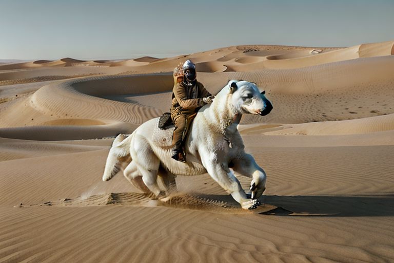 Capture an astonishing and surreal moment: a man, dressed in practical desert attire, confidently riding a polar bear through the undulating sand dunes of the Saharan Desert. The harsh sunlight casts sharp shadows on the golden sands, emphasizing the heat and aridness of the environment. The polar bear, seemingly out of its element, moves with a blend of grace and confusion. Ensure the details are ultra-realistic: the texture of the desert sand, the man's clothing billowing in the warm breeze, and the polar bear's fur against the backdrop of the endless dunes. Emphasize the contrast between the icy white fur and the scorching desert environment. Capture the astonishment and awe in the man's expression as he navigates this improbable scene. Aim for a seamless integration of the extraordinary into the ordinary, inviting viewers to question the boundaries of reality within this captivating image.