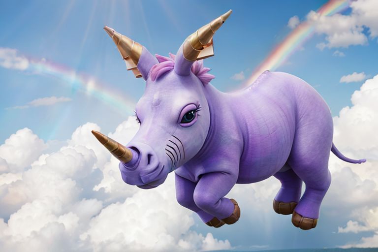 High definition, 8k, professional quality, bright, purple unicorn rhinosaurus, (horn on nose), happy, nice, smiling, beautiful, (big blue eyes), dilated pupils, jumping off a rainbow, bright, magical, clouds, god rays, light sky, blue, soft, full body view