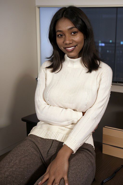photorealistic, ,20-year-old CrCh in a white cable-knit sweater sitting at her desk at the office, typing a memo on her keyboard, fluorescent lighting, , large breasts, cow girl, colored skin, snout, black hair,,, dark skin, hair over one eye,dark brown skin, smiling,