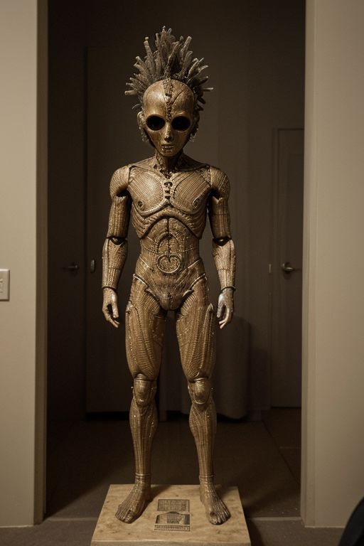 An artificial representation of a human-like entity with intricate patterns and symbols covering its surface. Notably, the head displays a complex geometric mesh possibly symbolizing neural pathways or cultural art. The figure is entwined with corded material, potentially indicating a ritualistic practice or symbol of confinement by the humans. SPECULATION. AMONIUM 1412KRLADNL91214 yousif Given the nonfunctional nature of this display, it may serve a ceremonial or artistic purpose within human society, reflecting abstract concepts or social constructs not immediately discernible to an extraterrestrial observer.