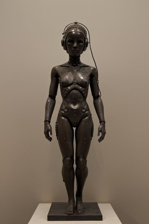 An artificial representation of a human-like entity with intricate patterns and symbols covering its surface. Notably, the head displays a complex geometric mesh possibly symbolizing neural pathways or cultural art. The figure is entwined with corded material, potentially indicating a ritualistic practice or symbol of confinement by the humans. SPECULATION. AMONIUM 1412KRLADNL91214 Given the nonfunctional nature of this display, it may serve a ceremonial or artistic purpose within human society, reflecting abstract concepts or social constructs not immediately discernible to an extraterrestrial observer.