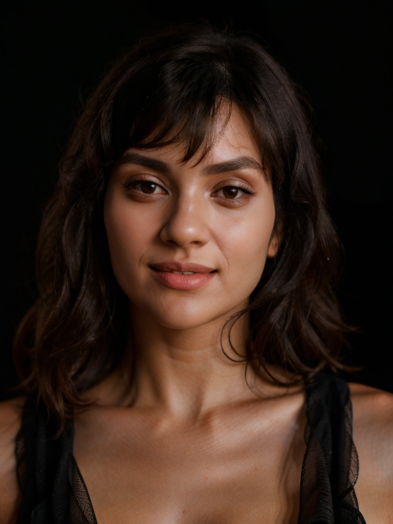 A beautiful 4g0st1n4b woman,1girl,solo,looking at viewer,smile,black hair,brown eyes,closed mouth,lips,black background,portrait,close-up,realistic,soft lighting, professional Photography, Photorealistic, detailed, RAW, analog, sharp focus, 8k, HD, high quality, masterpiece<lora:4g0st1n4b:1.0>