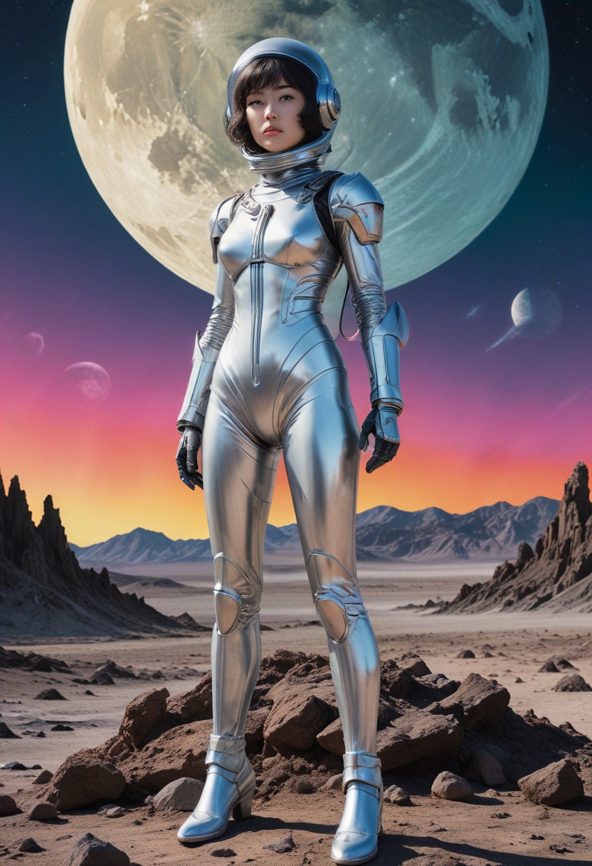 (a colorful action movie poster:1.2) of a 30s scifi woman tomie kawakami wearing a polished aluminum suit standing in a alien deserted moon landscape with a jetpack, a glass dome helmet, perfect hair (AtompunkSDXL)