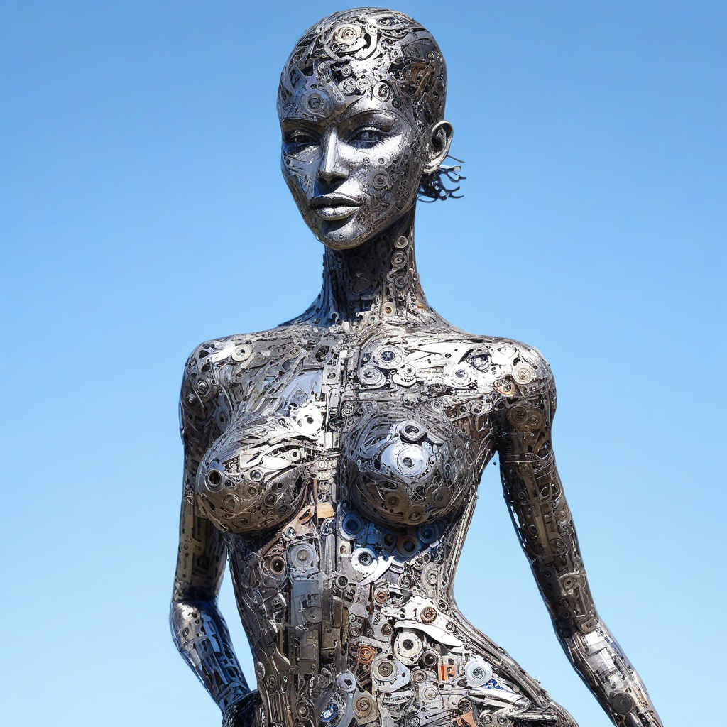 A striking sculpture of a woman crafted from scrap metal, posed elegantly like a model on a runway. Industrial materials, metallic shine, artistic, detailed craftsmanship, creative reuse, mechanical elements, dynamic pose, runway fashion, high detail, digital art, realistic, urban setting, high contrast, vibrant colors, industrial chic, recycled art, environmental theme, high resolution, ready for print, commercial use, dramatic lighting, sharp shadows, expressive, unique, futuristic, bold composition.