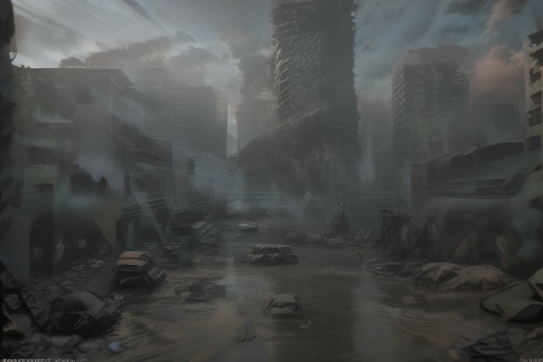 (post-apoc), (postapoc_vehicle),(ruined_cityscape), (camera shot of post-apocalyptic Los Angeles from highrise building), sunset, partially flooded streets, destroyed buildings, smoke trails from fires, 4k photorealistic art style