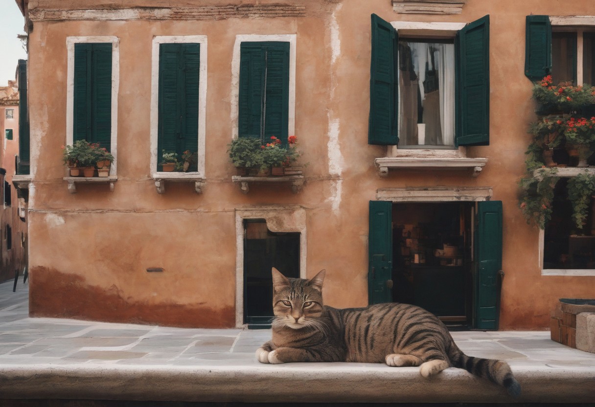 a charming cafe in Venice along a beautiful canal, masterpiece, best quality, open seating, nice clear day, no people, a cozy couch, fat brown tabby cat sleeping. beautiful light
