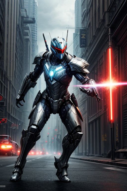 masterpiece, best quality, absurdres, illustration, photorealistic, cinematic, dynamic, futuristic armor, integrated weapons, digital displays, neon highlights, mechanical limbs, energy shield, urban battlefield