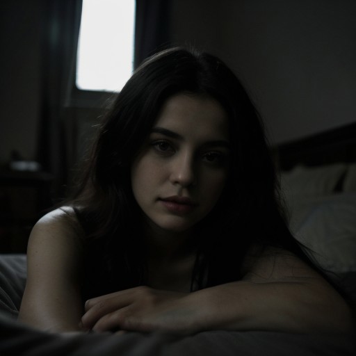 pitch black background and room, photorealistic, best quality, stunning lovely gothic lady, lying on her bed at home, watching a little bat who accidental got lost in her room cause of the open window