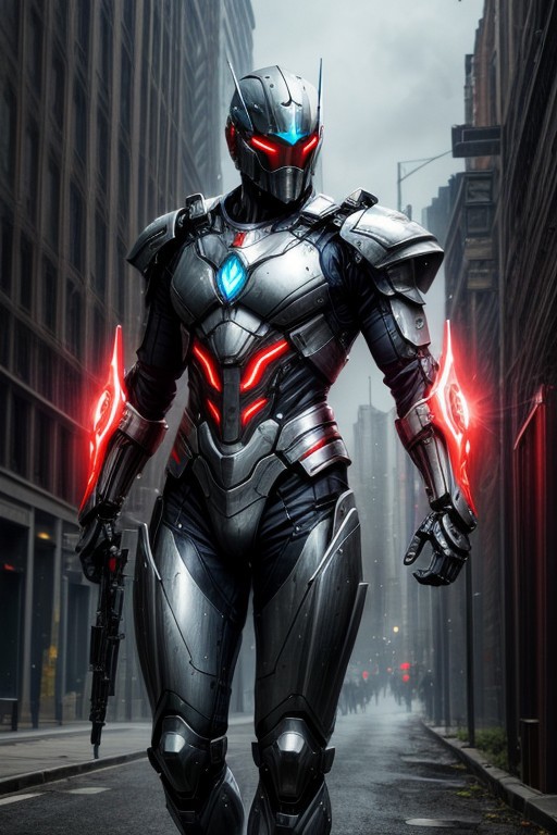 masterpiece, best quality, absurdres, illustration, photorealistic, cinematic, dynamic, futuristic armor, integrated weapons, digital displays, neon highlights, mechanical limbs, energy shield, urban battlefield