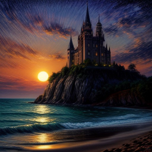 Generate an impressionist-style oil painting of a castle on a stunning beach during sunset.