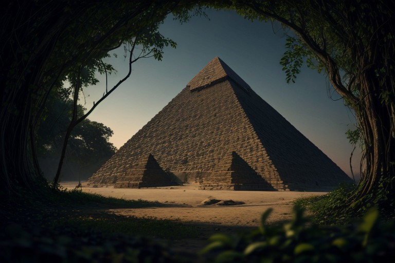 A photorealistic render of the The Great Pyramid of Giza, covered in overgrown vines, low-light, evening.