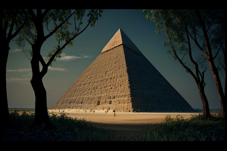 A photorealistic render of the The Great Pyramid of Giza, covered in overgrown vines, low-light, evening.
