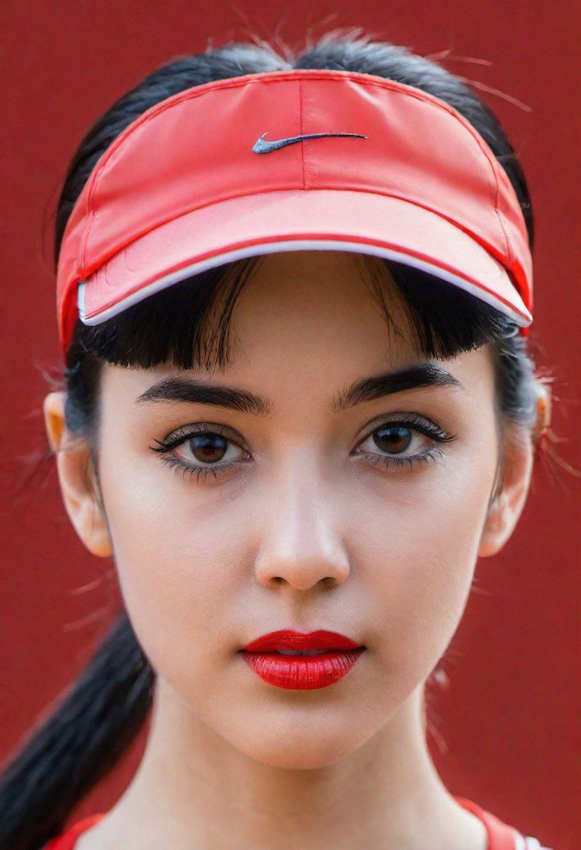 front view ultra close-up portrait a charming and seductive girl wearing a ((red transparent plastic tennis visorcap)) <lora:VisorCapXL-01:1>, short black hair, dark makeup, black deep eyes, deep stare, symmetric view, masterpiece, ultra detailed, ultrarealistic portrait, intricate details, hyper details, natural skin details, red background, lipstick, sunlight