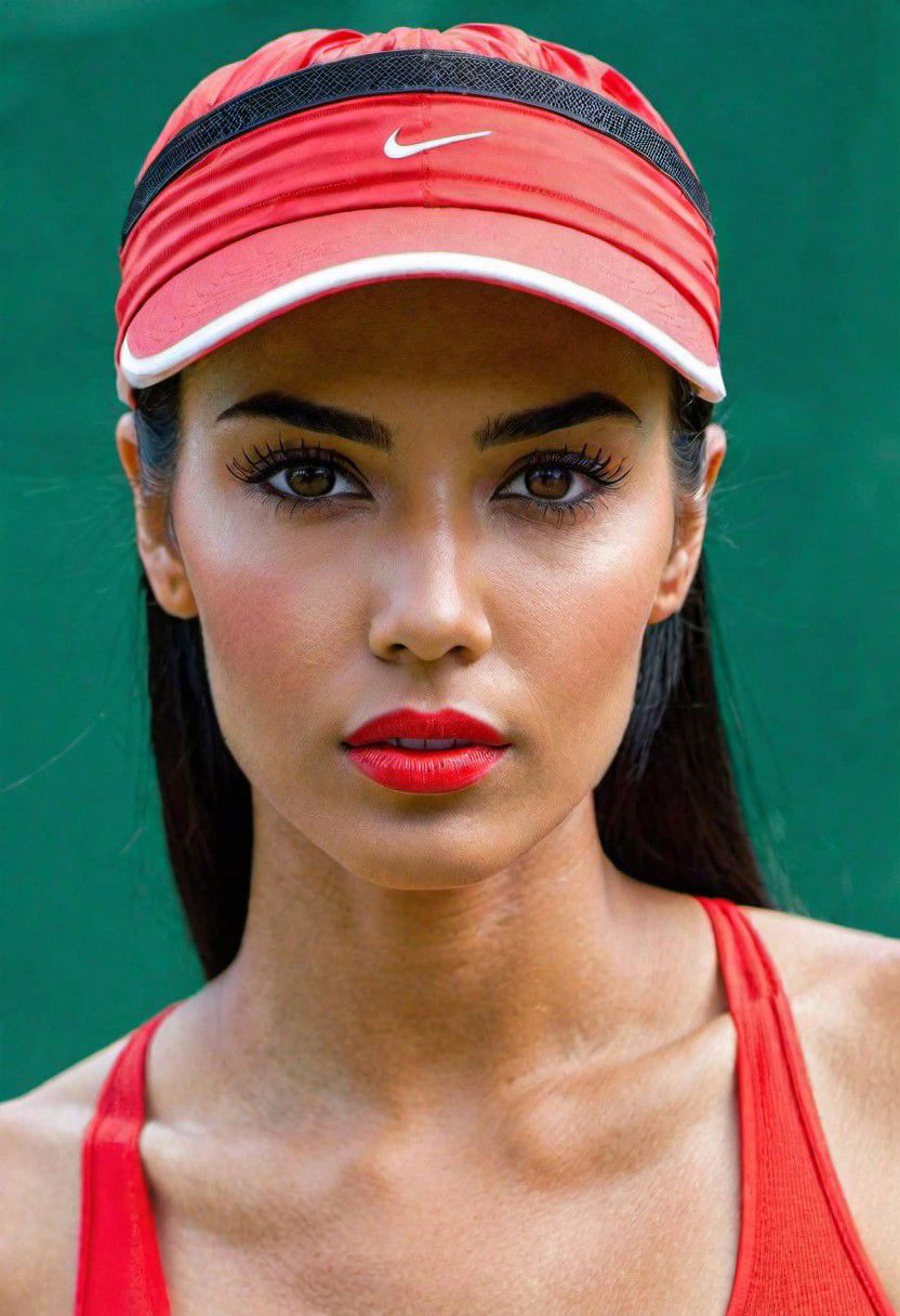 front view ultra close-up portrait a charming and seductive girl wearing a ((red transparent plastic tennis visorcap)) <lora:VisorCapXL-01:1>, short black hair, dark makeup, black deep eyes, deep stare, symmetric view, masterpiece, ultra detailed, ultrarealistic portrait, intricate details, hyper details, natural skin details, red background, lipstick, sunlight