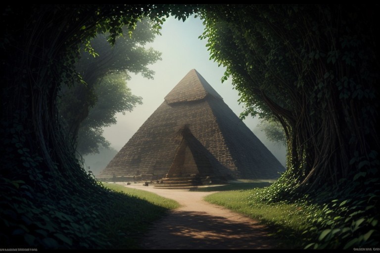 A photorealistic render of the The Great Pyramid of Giza, covered in overgrown vines, low-light, evening.