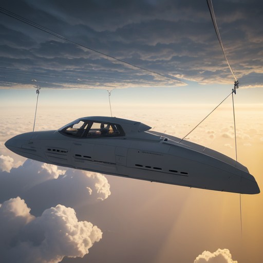 flying featureless craft, no windows, futuristic world, grey slab sided craft, rectangular in shape, anti gravity, in the atmosphere, sky, clouds, ground visible, hovering, hanging cables, dusty, orange light, sunlight