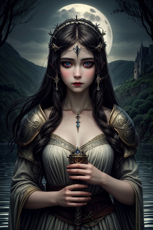 (masterpiece), best quality, expressive eyes, clear bright eyes, perfect face, the Lady of the Lake, medieval enchantress, in the Isle of Avalon, dusk, moonlight, mysterious, dark haired; Welsh mythology, fantasy