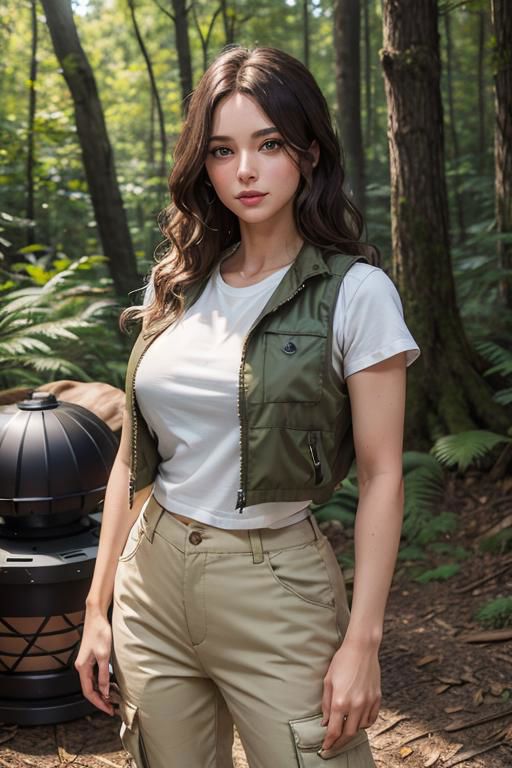 ((Caucasian girl)), Sweet expression, posing seductively, ((wavy hair, brown hair)), (8k, RAW photo, photorealistic:1.25) ,( lip gloss, eyelashes, glossy face, shiny skin, best quality, super high resolution , depth of field, chromatic aberration, caustics, , natural shadows, looking at viewer with serenity and goddess-like bliss, full body, big breasts, ((green trail vest, white t-shirt, khaki short pants)), campfire, campsite, woods, forest, ((nighttime)),