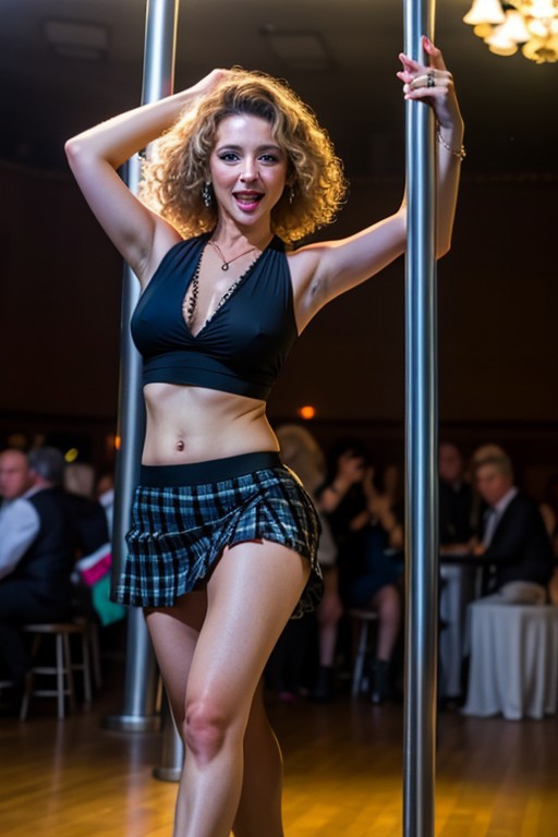 Modelshoot (Candid 1.3) nsfw photo of (60 year old:1.6) Hungarian model, full body view, striking eyes, medium blonde hair, voluminous curly hair, ecstatic expression, lip gloss, wearing black pleated skirt, ripped bodystogking, dancing on a pole dancing pole, looking at the viewer, Natural lighting, shot using a Leica T in the style of (Daniel Jackson: 1.3) High details, complex and detailed face, detailed eyes, detailed skin, shallow depth of field , swingers club