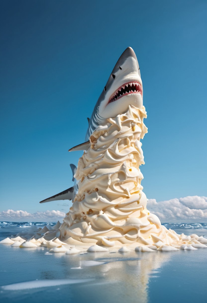 made of ice cream, a detailed sea made of ice cream, a realistic very detailed shark made of ice cream, a very realistic ice cream shark, very detailed ice cream clouds in the sky, highest contrast, masterpiece, 32k, high contrast, vibrant colors, vivid colors, high resolution textures, crisp colors, ultra sharp, sharp focus,