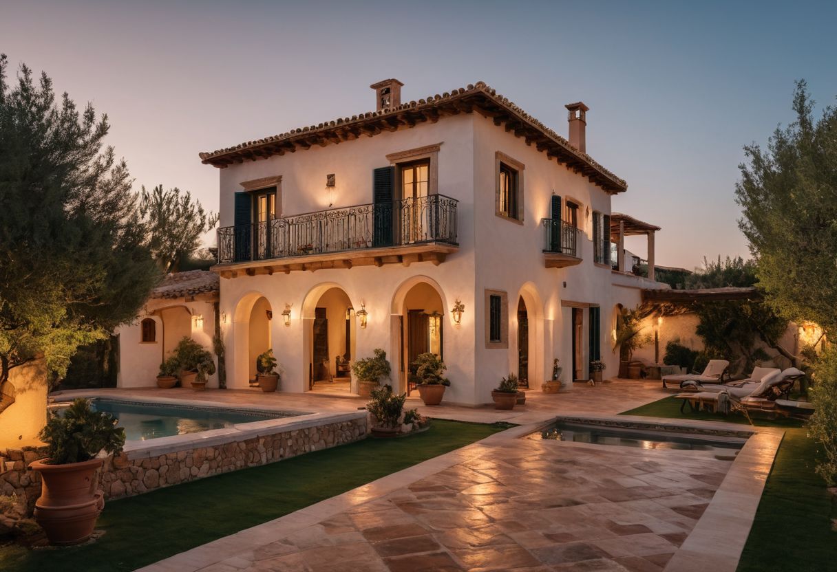 RAW photos,spanish style villa exterior view evening time ,beautiful landscape, 8k uhd, dslr, soft lighting, high quality, film grain, Fujifilm XT3